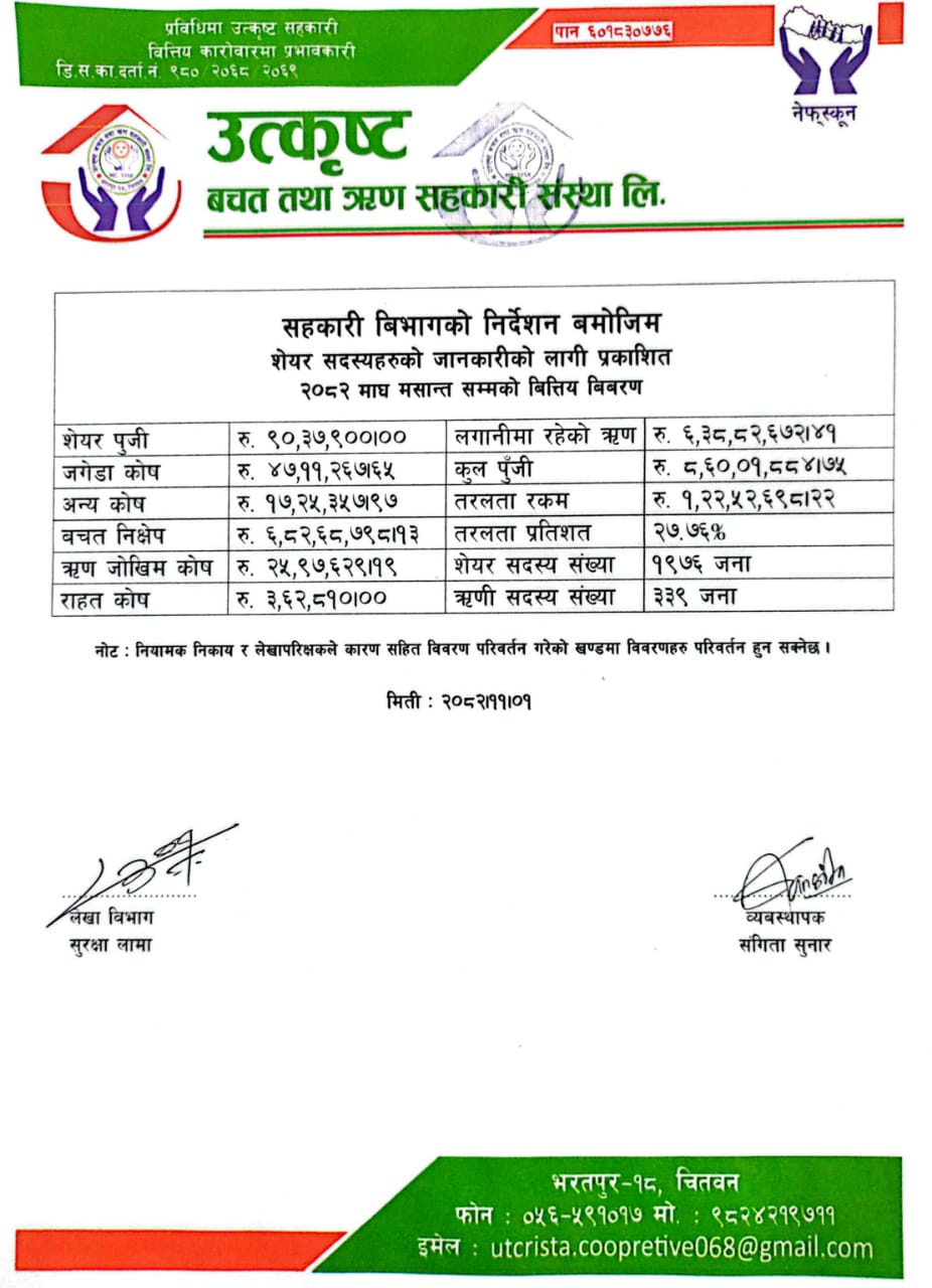 उत्कृष्ट बचत तथा ऋण सहकारी संस्था लि. भरतपुर-१८, चितवनमा स्थापना भएको एक अग्रणी सहकारी संस्था हो। सदस्यहरूको आर्थिक सशक्तिकरण र सामाजिक उत्थानलाई मुख्य उद्देश्य बनाई हामीले बचत, ऋण, र वित्तीय सेवाहरू सहज र विश्वासिलो रूपमा प्रदान गर्दै आएका छौँ। हाम्रो ध्येय सदस्यहरूको सानो बचतलाई ठूलो अवसरमा परिणत गर्दै, आत्मनिर्भरता र समृद्ध जीवनशैली निर्माण गर्नु हो।हामी पारदर्शिता, विश्वसनीयता, र आधुनिक सहकारी व्यवस्थापनलाई आत्मसात् गर्दै अघि बढिरहेका छौँ। हाम्रो लक्ष्य: सदस्यहरूको आर्थिक सुरक्षामा जोड दिनु सजिलो र सहज वित्तीय पहुँच उपलब्ध गराउनु सहकारी मूल्य र मान्यतामार्फत समुदायलाई समृद्ध बनाउन योगदान गर्नु "सहकारीबाट समृद्धि" हाम्रो मूलमन्त्र हो।